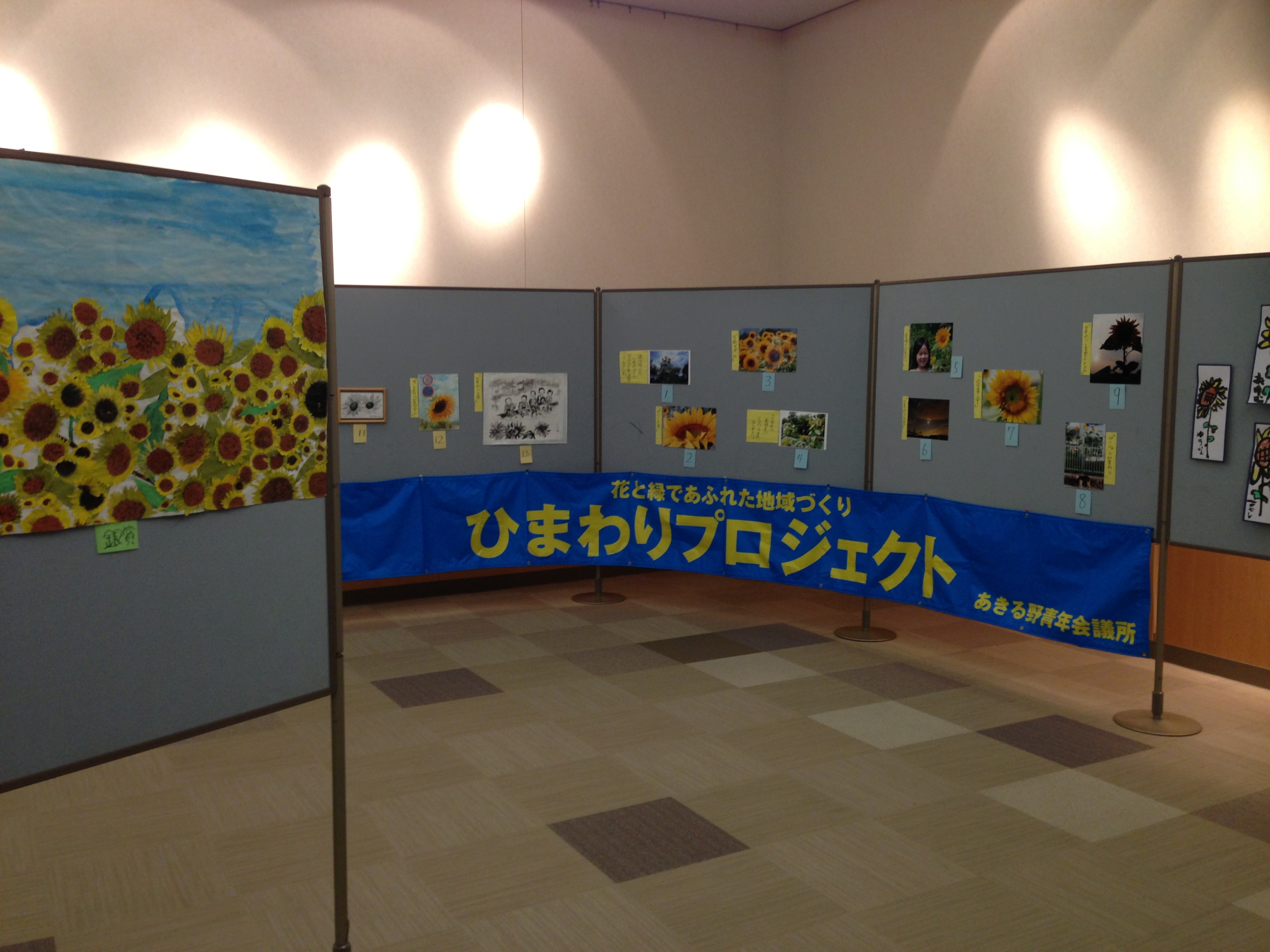 あきる野青年会議所では、2年前から「ひまわりプロジェクト」と題し、あきる野市役所前を東西に走る五日市街道やJR五日市線の線路沿い(秋川・東秋留間)、そして地域の花壇などに「ひまわりの種」を植え、夏の開花でまちを明るく元気にする運動を行っています。そして3年目の今年は、ひまわりを題材にした「ひまわり写真絵画展」を初開催しています。テーマは「ひまわりと、、、」で、「ひまわりと笑顔」や「ひまわりと家族」など自由な発想で作品を仕上げて応募して下さった作品を展示しております。