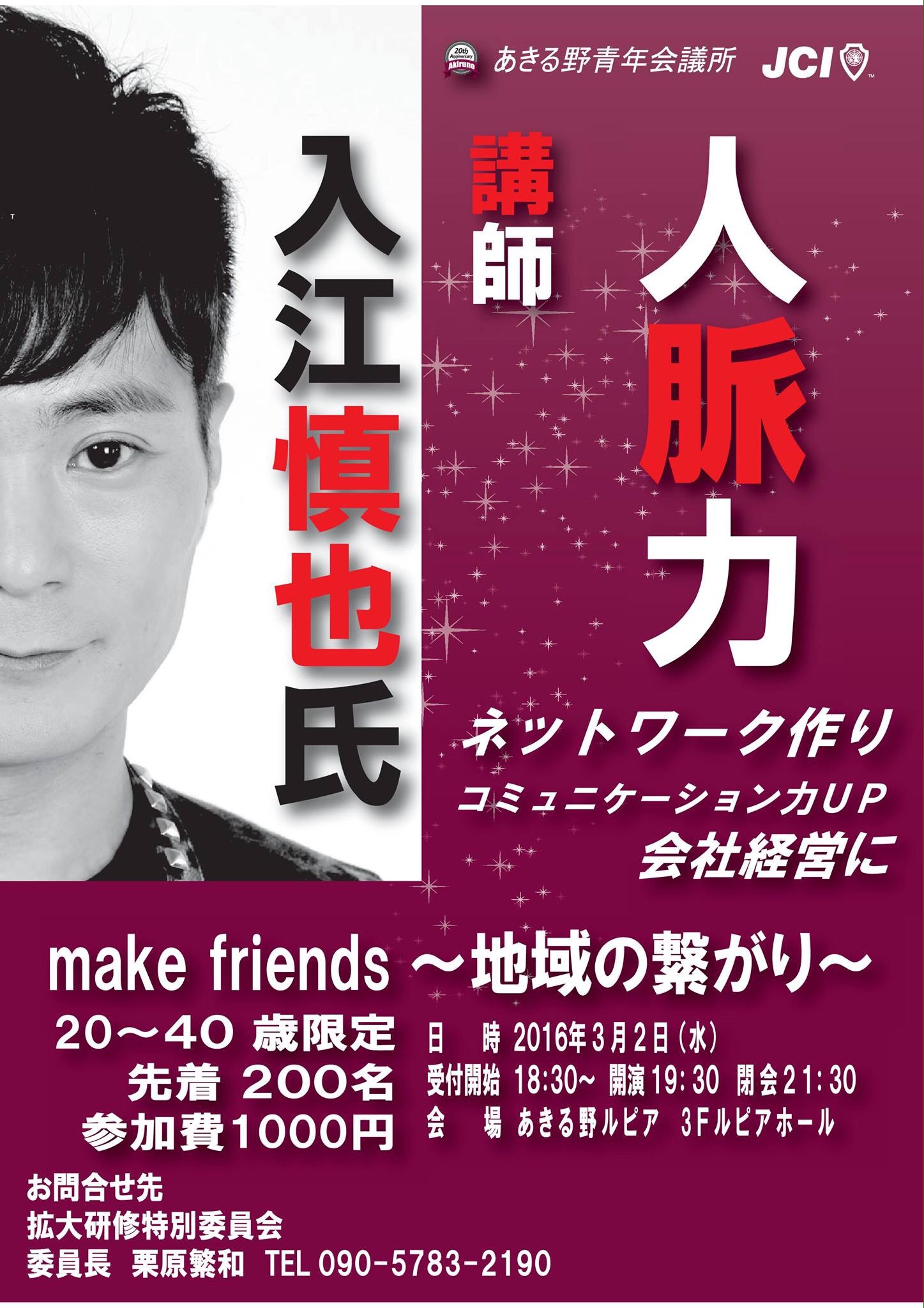 「人脈力を高めたい!」20歳から40歳の皆様! 講演を参考に自分なりに高めてみてはいかがでしょうか? 皆様のご参加お待ちしております!!