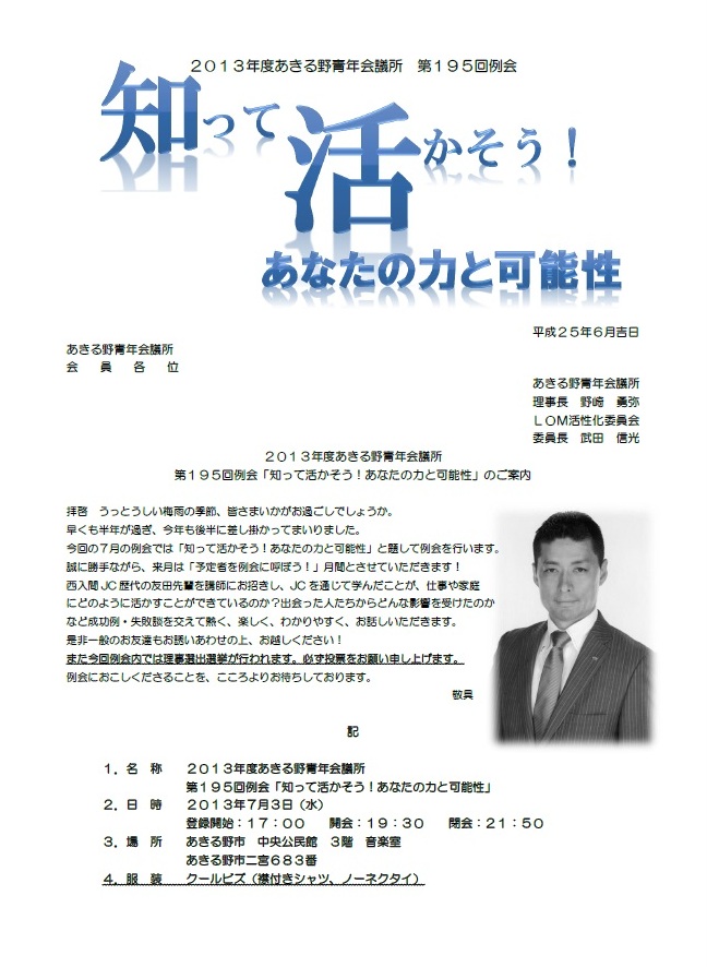 第195回例会 「知って活かそう!あなたの力と可能性」のご案内 2026 1/17 お知らせ トピックス 2013.06.242026.01.17 お知らせ トピックス よかったらシェアしてね! URLをコピーしました! URLをコピーしました! 第1回 絆プロジェクト2013 ひまわりプロジェクト臨時開催 関連記事 第343回例会「新年賀詞交歓会」のご案内 2026.01.17 第7回わんぱく相撲 秋川場所のお知らせ 2025.03.13 3/15(土):日の出町長選挙候補者 公開討論会のお知らせ 2025.03.10 第333回例会「人を引き付けるリーダーへの道~魅力を伝える情報発信を学ぼう~」 2025.02.14 第331回例会「新年賀詞交歓会」のご案内 2024.12.17 第330回 例会 「クリスマスパーティー・卒業式」ご案内 2024.12.01 第6回秋川流域花火大会のお知らせ 2024.11.07 第328回 例会 「人の心動かすリーダーのコミュニケーション術」 2024.10.01
