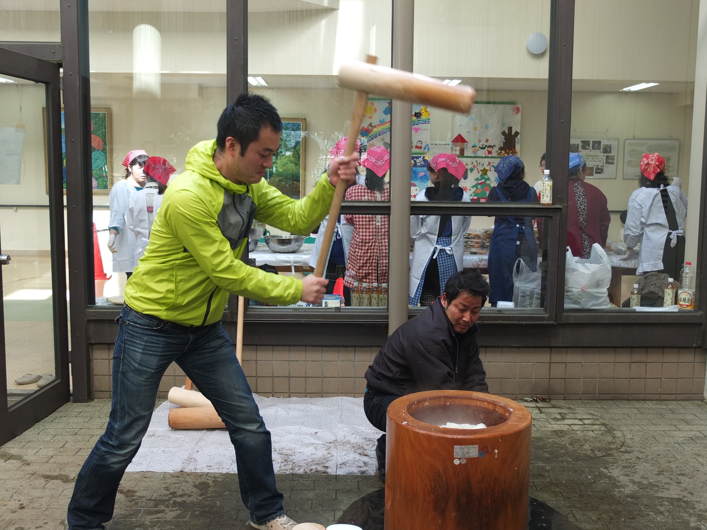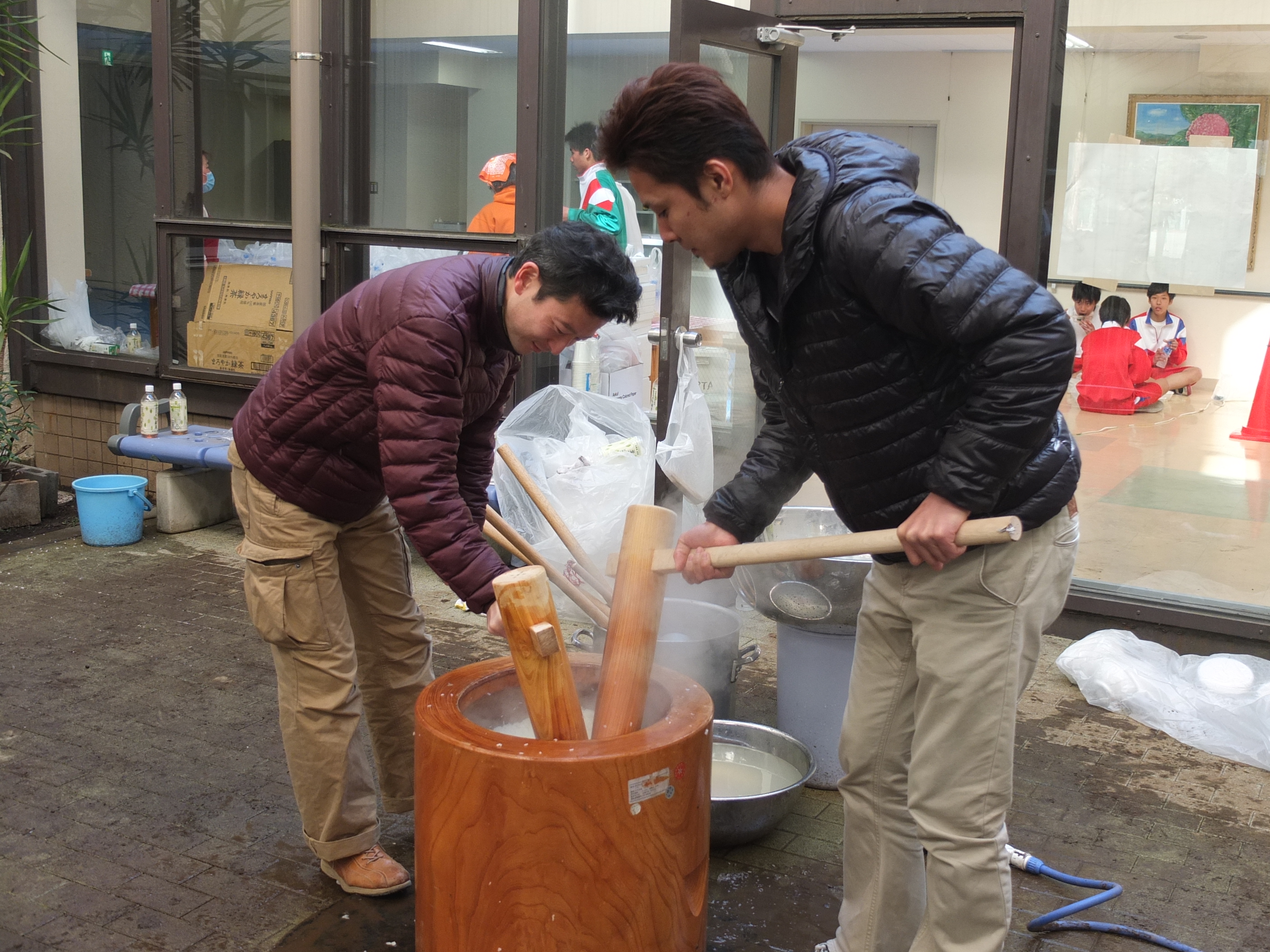 学生たちがマラソンを走っている間に、PTAの方と先生方がお餅をついて